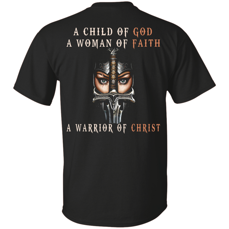 A Child Of God A Woman Of Faith A Warrior Of Christ Shirt - Back Design