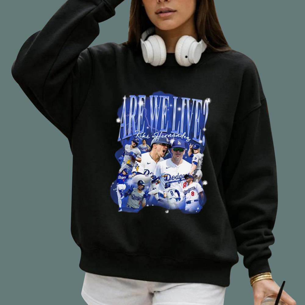 The Are We Live? Kike Hernández Champion 2025 T-Shirt captures that once-in-a-lifetime surge of adrenaline — a mix of humor, confidence, and triumph. The bold metallic-blue text “ARE WE LIVE?” blazes across a collage of action shots, freezing Kike’s most iconic highlights in motion.